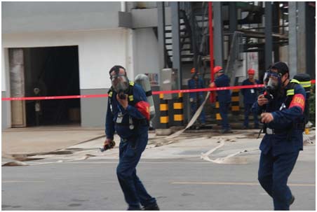 抢险小组穿戴重型(A级)防化服和空气呼吸器进入现场抢修